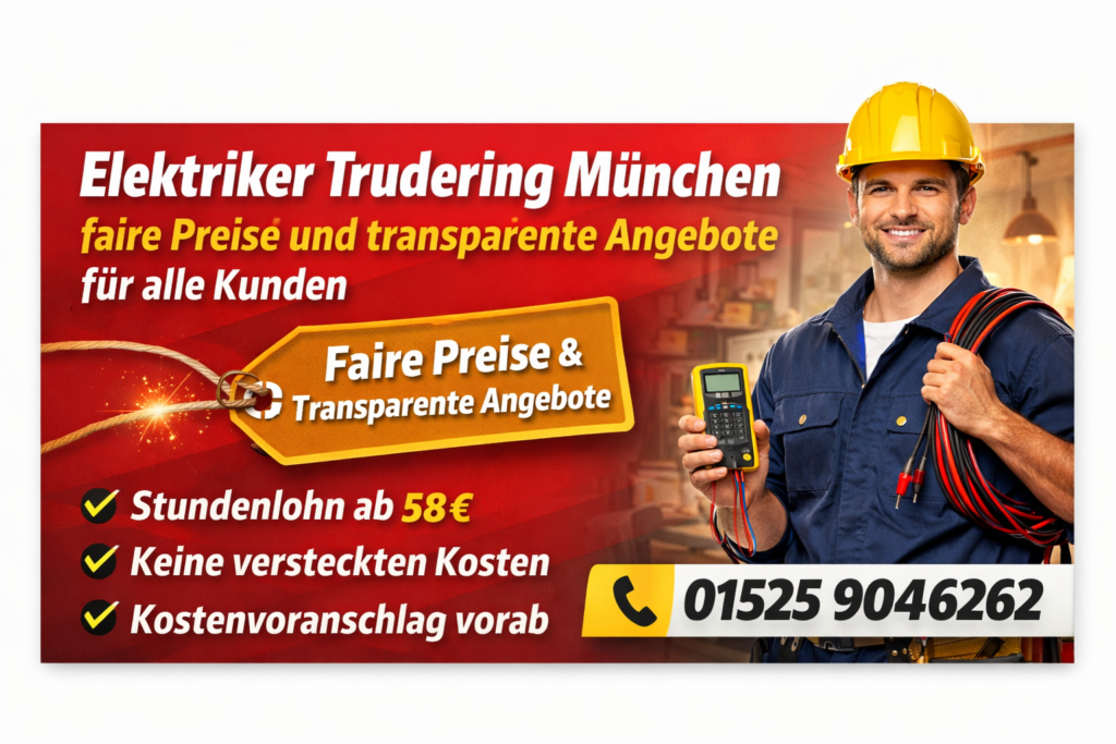 Elektriker Trudering München ab 58 € steht für schnelle, sichere und professionelle Hilfe bei allen Elektroproblemen in Ihrem Zuhause oder Betrieb. Von präziser Elektroplanung über fachgerechte Reparaturen bis hin zu modernen Sicherheitsprüfungen erhalten Sie bei uns zuverlässige Leistungen direkt vor Ort – sauber, effizient und transparent, ohne versteckte Kosten.