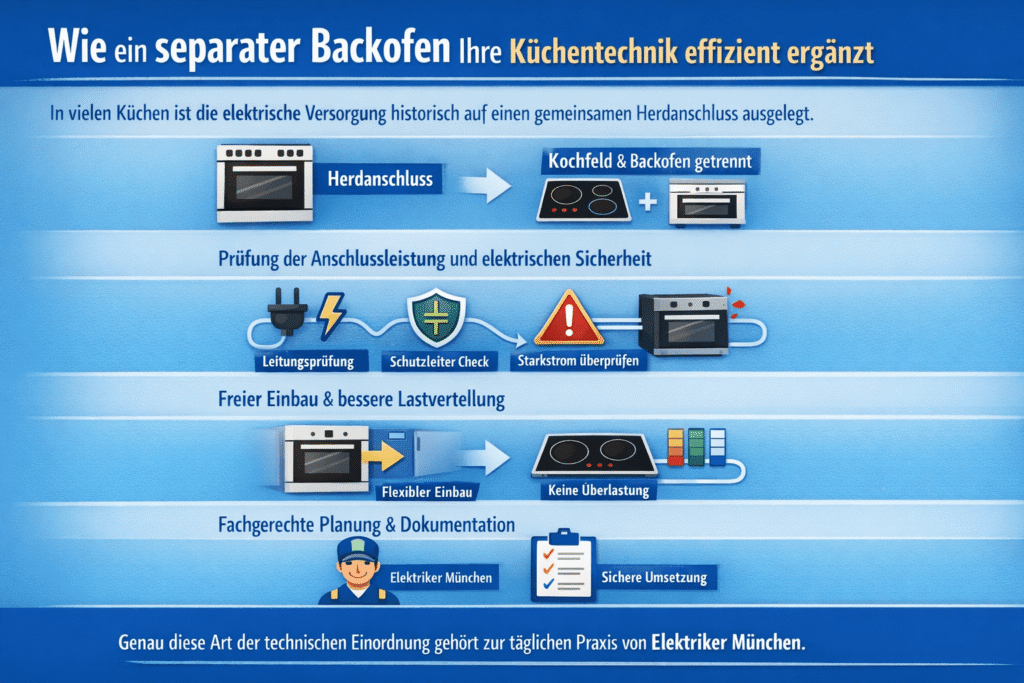 Beim separater backofen entscheidet die richtige Zuordnung von Leitung, Schutzleiter, Klemmenbild und Überstromschutz darüber, ob der Betrieb stabil und normgerecht bleibt. Improvisierte Verdrahtungen können Erwärmung, Auslösungen oder Folgeschäden verursachen; eine Prüfung durch Elektriker München stellt Messwerte und Ausführung sauber sicher und klärt die technische Umsetzung strukturiert.