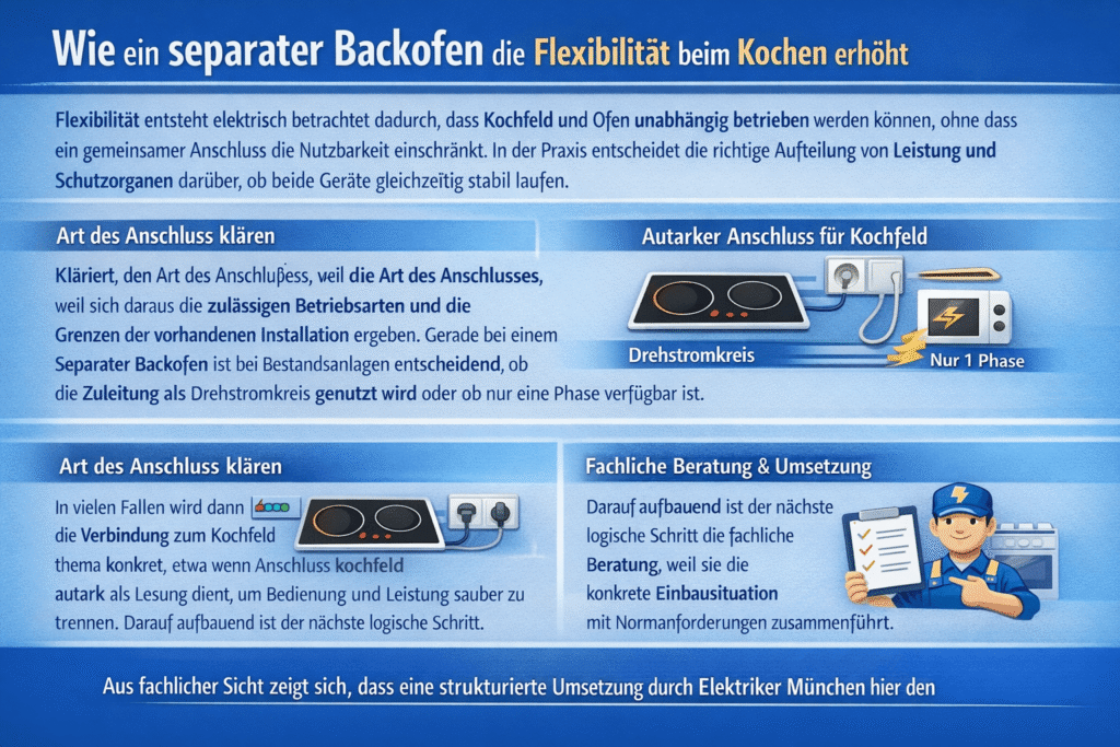 Flexibilität entsteht elektrisch betrachtet dadurch, dass Kochfeld und Ofen unabhängig betrieben werden können, ohne dass ein gemeinsamer Anschluss die Nutzbarkeit einschränkt. In der Praxis entscheidet die richtige Aufteilung von Leistung und Schutzorganen darüber, ob beide Geräte gleichzeitig stabil laufen.